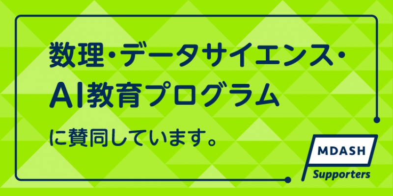 2022.02.02「数理・データサイエンス・AI教育プログラム(MDASH)」の認定を受けた大学・高等専門学校の取組みに賛同し、MDASH SUPPORTERとして、これからの産業界を担う学生の皆様の学びとスキル習得を支援するとともに、より良い未来をともに目指していきます。