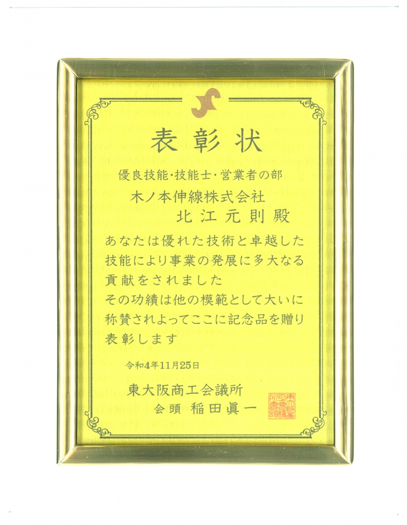 2022.11.25当社社員の北江 元則が、優れた技術と卓越した技能で、事業の発展に多大な貢献をした功績により、「令和4年度優良商工従業員表彰」を東大阪商工会議所より、受賞しました。