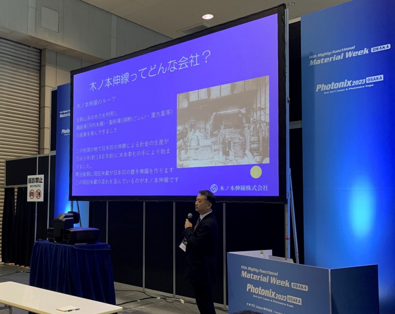 2023.05.18代表取締役社長の木ノ本 裕が、インテックス大阪で開催された高機能金属展2023(関西メタルジャパン)で、「木ノ本伸線のマグネシウム合金普及への取り組み」についてセミナー講演を行いました。