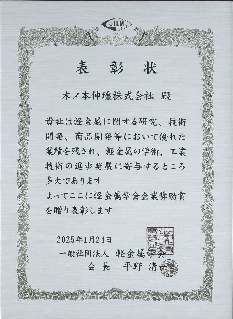 2025.04.21軽金属に関する研究、技術開発、商品開発等において優れた業績を残し、軽金属の学術、工業技術の進歩発達への寄与が認められ、軽金属学会奨励賞を受賞しました。特に、マグネシウム合金に関する技術開発・商品開発等の優れた業績が認められ、今回のご受賞に繋がりました。
