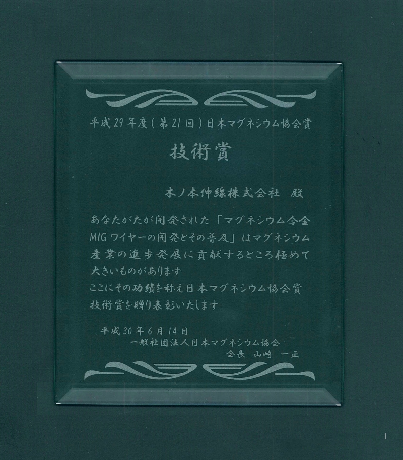 2018.06.14受賞事由「マグネシウム合金MIGワイヤーの開発とその普及」